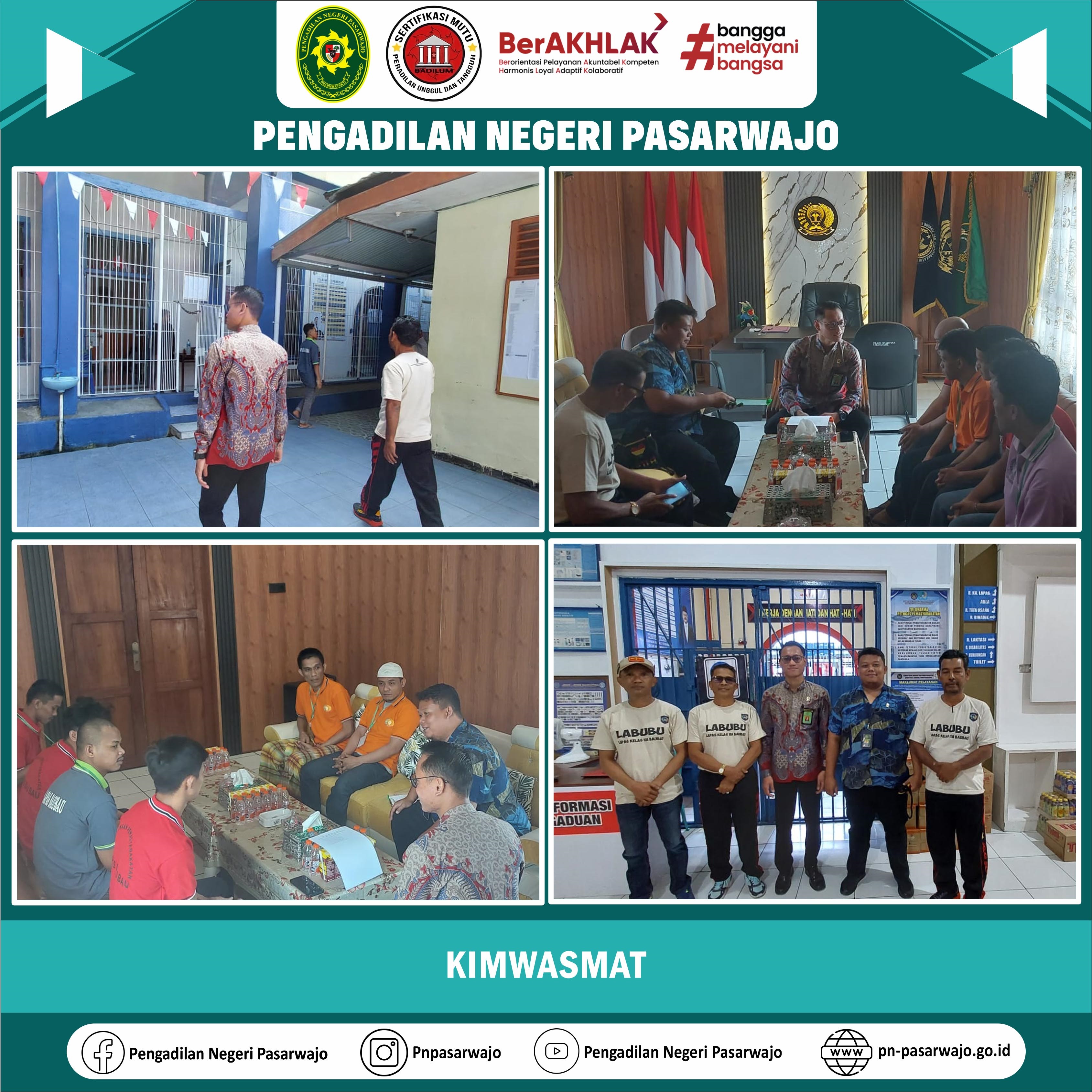 Pasarwajo | Jumat, 22 Agustus 2025, Dalam rangka melaksanakan salah satu tugas Hakim Pengawas dan Pengamat (KIMWASMAT) sehingga diadakan kegiatan kunjungan ke Lembaga Pemasyarakatan Baubau. Adapun kegiatan KIMWASMAT mengacu pada Undang-Undang No.8 Tahun 1981 (KUHAP) Jo. Surat Edaran Mahkamah Agung RI Nomor 7 Tahun 1985 Tentang Petunjuk Pelaksanaan Tugas Hakim Pengawas dan Pengamat.