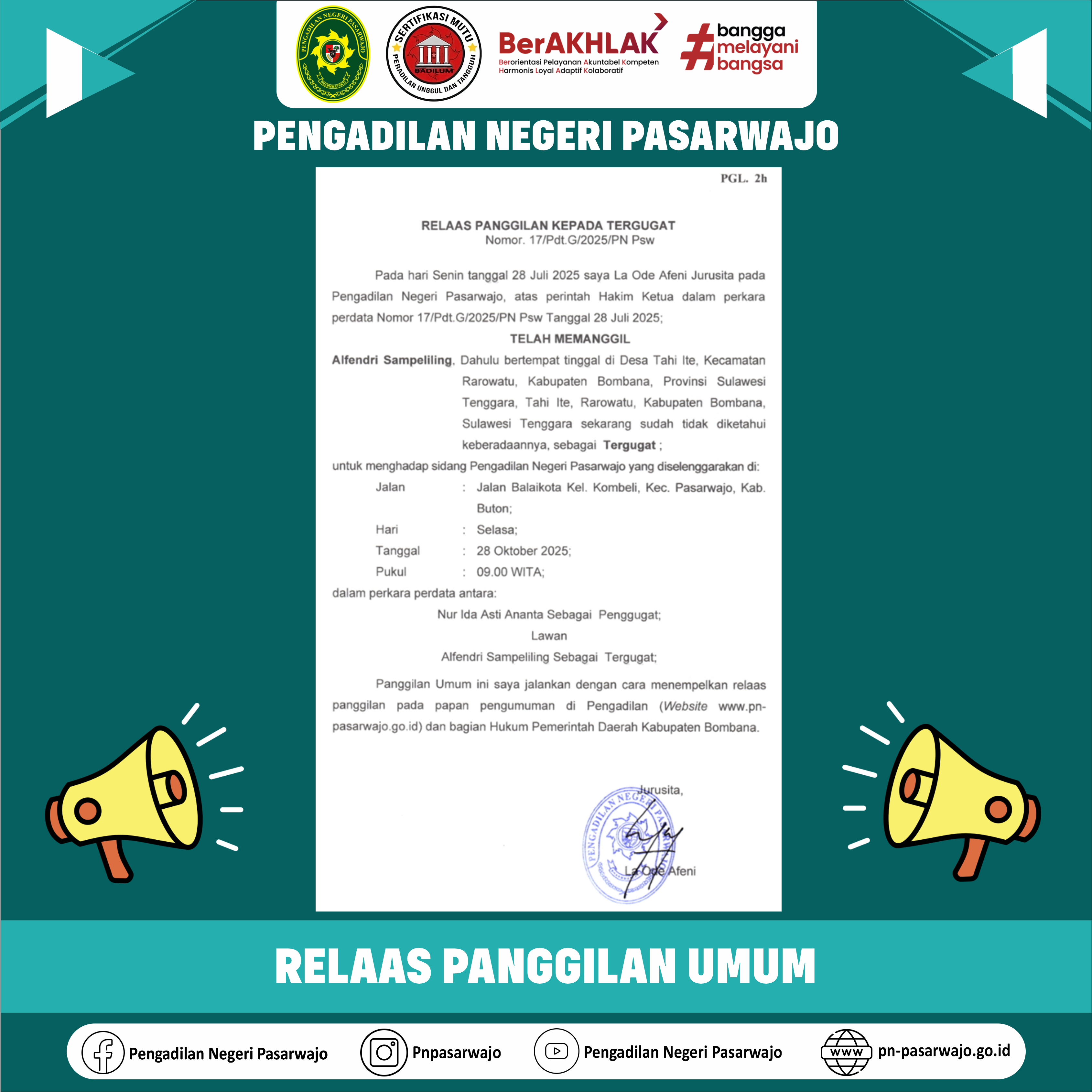 Pasarwajo | Senin 28 Juli 2025, Diberitahukan Panggilan Umum kepada Tergugat Perkara Nomor 17/Pdt.G/2025/PN Psw a.n ALFENDRI SAMPELILING yang dahulu bertempat tinggal di Desa Tahi Ite, Kecamatan Rarowatu, Kabupaten Bombana, Provinsi Sulawesi Tenggara, Tahi Ite, Rarowatu, Kabupaten Bombana, Sulawesi Tenggara namun sekarang sudah tidak diketahui lagi tempat tinggal/keberadaannya di wilayah NKRI. Agar Tergugat a.n ALFENDRI SAMPELILING datang ke Persidangan Pengadilan Negeri Pasarwajo pada hari Selasa, tanggal 28 Oktober 2025 pukul 09:00 WITA.