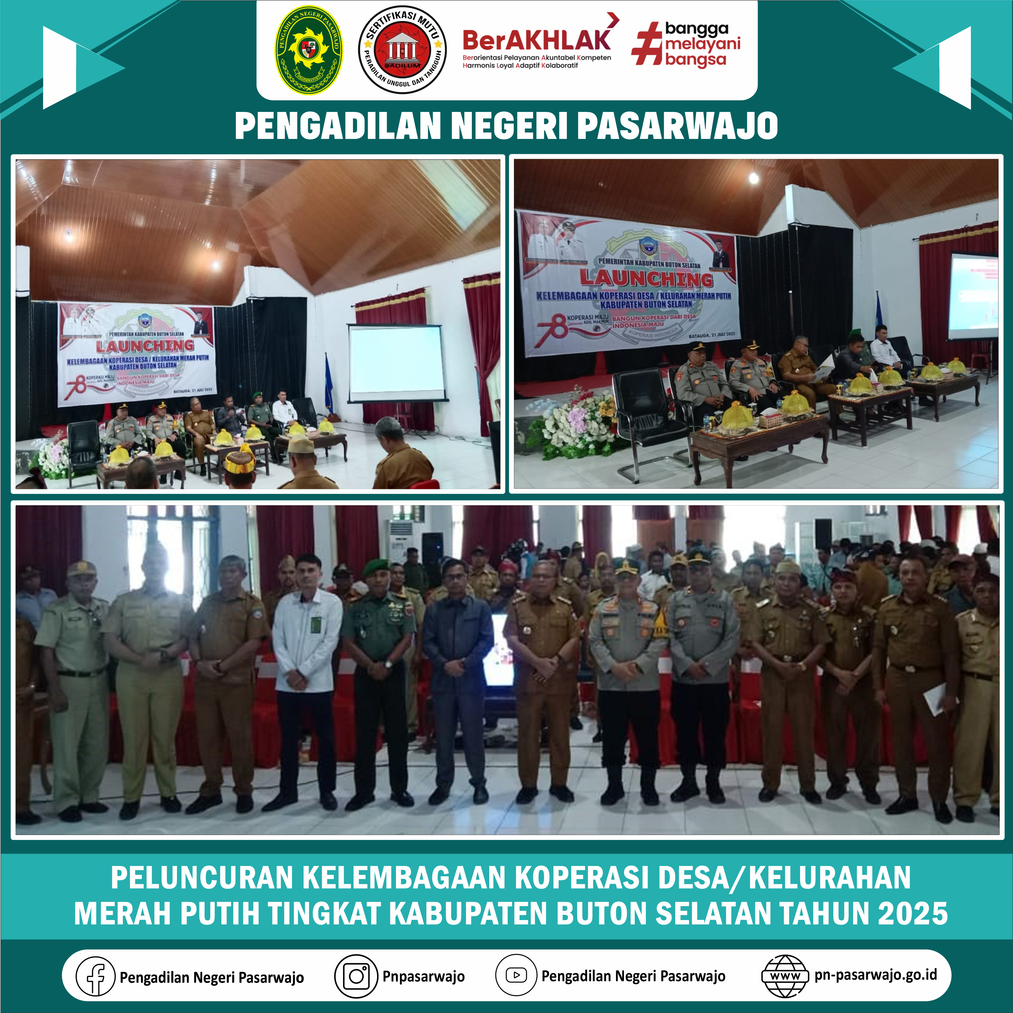 Pasarwajo | Senin, 21 Juli 2025, sehubungan dengan undangan Peluncuran Kelembagaan Koperasi Desa/Kelurahan Merah Putih Tingkat Kabupaten Buton Selatan Tahun 2025, Bapak Indra Kurnia Sinulingga, S.H., Hakim Pengadilan Negeri Pasarwajo mewakili Ketua Pengadilan menghadiri kegiatan tersebut yang dilaksanakan di Gedung Wisata, Batauga, Kabupaten Buton Selatan, Sulawesi Tenggara. Acara ini dilaksanakan sehubungan dengan peluncuran 80.000 Koperasi Desa/Kelurahan Merah Putih oleh Bapak Presiden Republik Indonesia secara serentak di seluruh Indonesia.