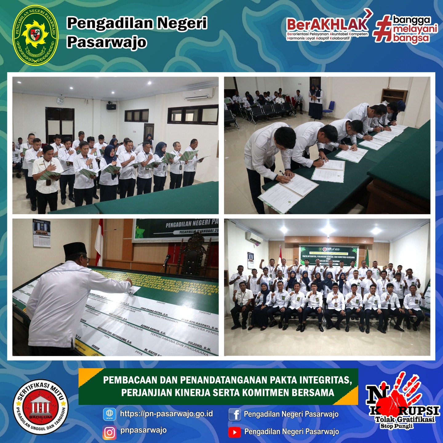 Pasarwajo | Senin, 12 Januari 2026, bertempat di Ruang Sidang Utama Pengadilan Negeri Pasarwajo Senin (12/1/2026) pada pukul 09.45 WITA, Telah diselenggarakan Acara Pembacaan dan Penandatanganan Pakta Integritas, Perjanjian Kinerja serta Komitmen Bersama pada Pengadilan Negeri Pasarwajo Tahun 2026. Ketua Pengadilan Negeri Pasarwajo Bapak Ivan Budi Hartanto, S.H., M.H. memimpin langsung Pembacaan dan Penandatanganan Pakta Integritas, Perjanjian Kinerja serta Penandatanganan Komitmen Bersama yang diikuti oleh para Hakim, Panitera dan Sekretaris serta seluruh Aparatur Peradilan pada Pengadilan Negeri Pasarwajo. Pakta Integritas bertujuan untuk memperkuat komitmen bersama seluruh aparatur peradilan dalam mencegah korupsi, kolusi, dan nepotisme (KKN) serta penyalahgunaan wewenang, dengan menjunjung tinggi kejujuran, transparansi, dan profesionalisme agar tercipta pelayanan publik yang bersih, berkeadilan, Sedangkan Komitmen Bersama bertujuan untuk melaksanakan dengan sungguh – sungguh Maklumat Ketua Mahkamah Agung RI Nomor 1/Maklumat/KMA/IX/2017 Tanggal 13 September 2017 tentang Pengawasan dan Pembinaan Hakim, Aparatur Mahkamah Agung dan Badan Peradilan Dibawahnya.