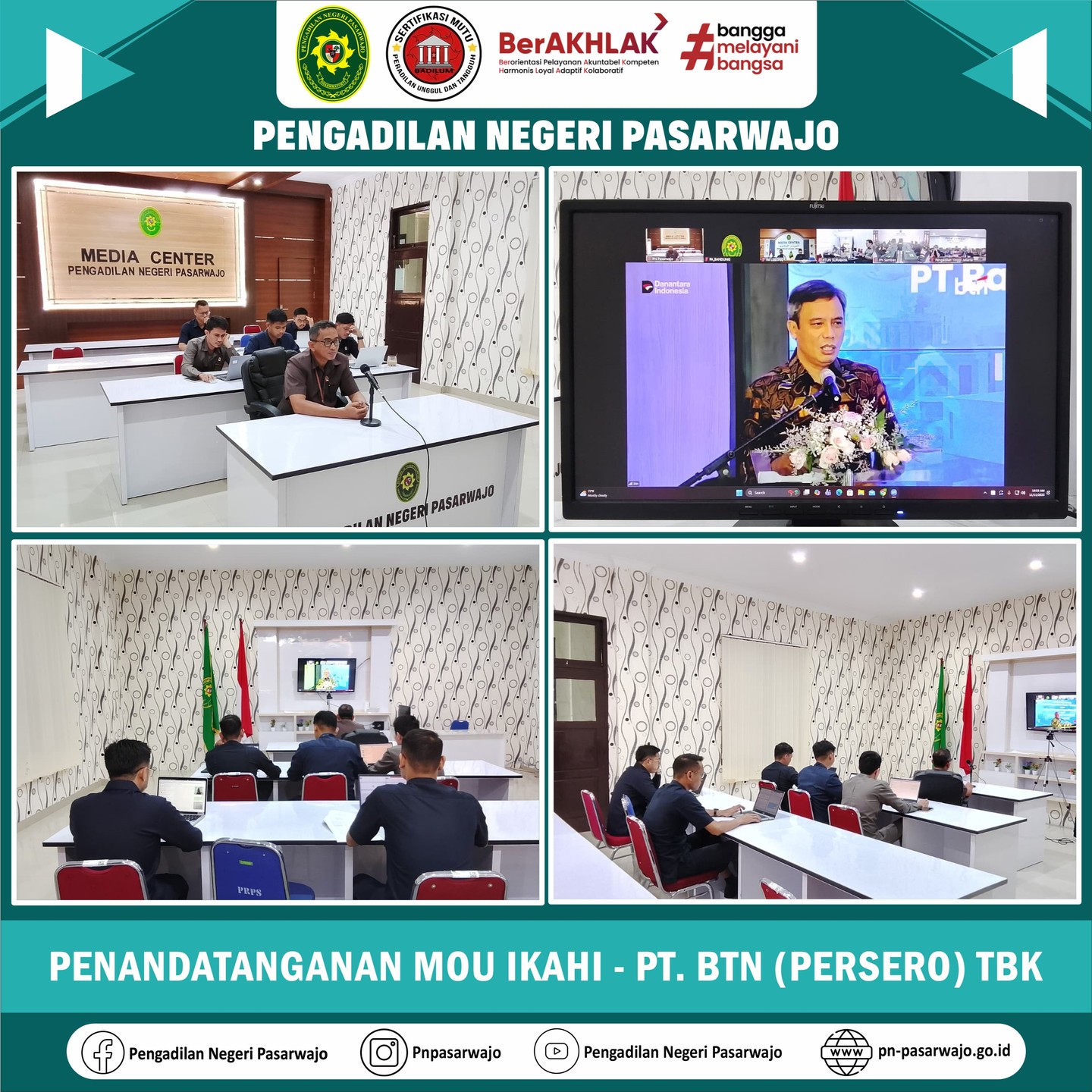 Pasarwajo | Selasa, 11 November 2025, Ketua Pengadilan Negeri Pasarwajo bersama Para Hakim telah mengikuti Kegiatan Penandatanganan Memorandum of Uderstanding (MoU) antara IKAHI dan Bank Tabungan Negara (BTN) serta sosialisasi Program Kepemilikan Hunian-Graha Hakim. Kegiatan tersebut di ikuti secara daring atau virtual bertempat di Media Center Pengadilan Negeri Pasarwajo.