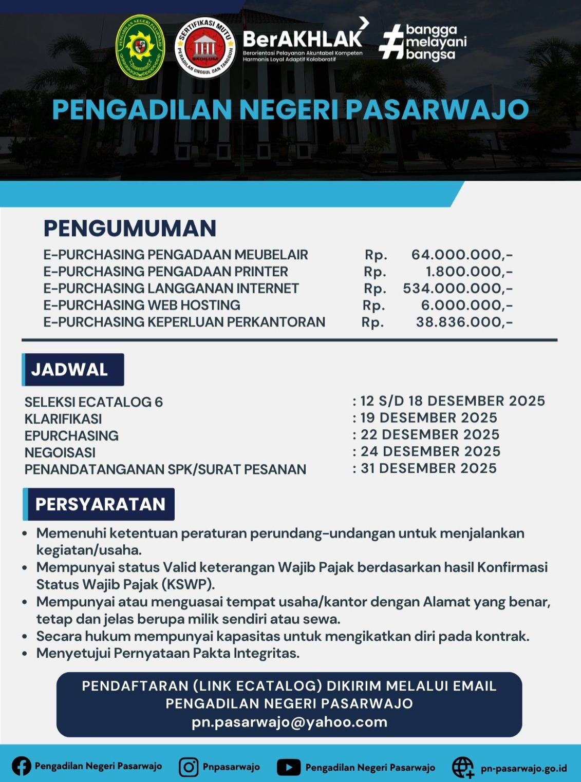 Pengadilan Negeri Pasarwajo membuka Pendaftaran E-PURCHASING untuk :