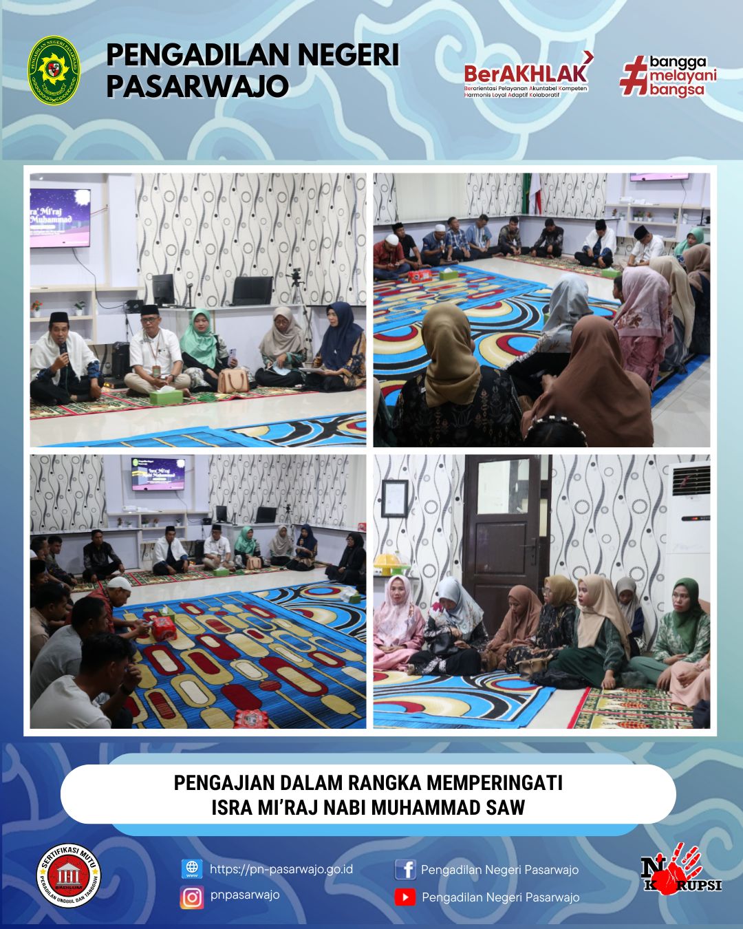 Pasarwajo | Jumat, 30 Januari 2026, Pengadilan Negeri Pasarwajo telah melaksanakan kegiatan Pengajian dalam rangka memperingati Isra Mi’Raj Nabi Muhammad SAW. Kegiatan tersebut dilaksanakan bertempat di Media Center Pengadilan Negeri Pasarwajo. Perjalanan agung Rasulullah Baginda Nabi Muhammad SAW dari Masjidil Haram ke Sidratul Muntaha mengajarkan kita tentang keikhlasan dan kekuatan iman. Semoga peringatan ini membawa keberkahan dan kedamaian dalam setiap langkah kita dan Semoga cahaya Isra Mi’raj menerangi langkah kita dalam mencari keberkahan hidup.
