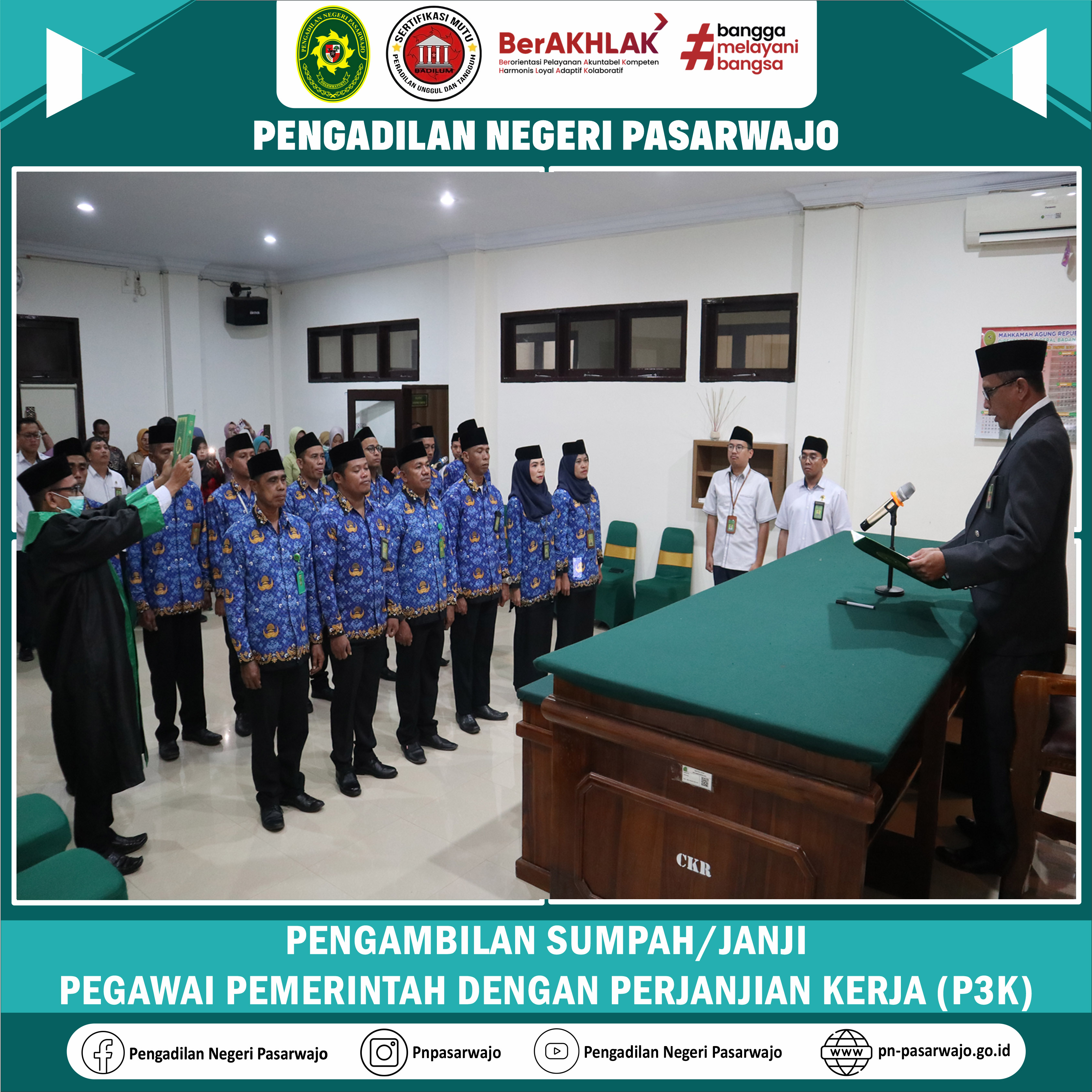 Pasarwajo | Senin, 1 September 2025, Bapak Ivan Budi Hartanto, S.H., M.H., Ketua Pengadilan Negeri Pasarwajo melaksanakan Pengambilan Sumpah/Janji Pegawai Pemerintah Dengan Perjanjian Kerja (PPPK). Dalam acara ini, Beliau mengambil sumpah/janji 13 orang Pegawai Pemerintah Dengan Perjanjian Kerja (PPPK) yaitu :