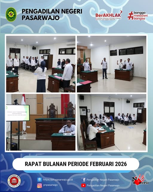 Pasarwajo | Senin, 23 Februari 2026, Pengadilan Negeri Pasarwajo telah menggelar Rapat Bulanan Periode Februari 2026 bertempat di Ruang Sidang Utama pada pukul 09.00 WITA. Rapat bulanan dipimpin oleh Ketua Pengadilan Negeri Pasarwajo Bapak Ivan Budi Hartanto, S.H., M.H. dan dihadiri oleh para Hakim, Panitera, Sekretaris dan seluruh Aparatur Pengadilan Negeri Pasarwajo. Adapun agenda Rapat Bulanan Periode Bulan Februari 2026 ini yaitu Tindak Lanjut Rekomendasi Berdasarkan Rapat Bulan Januari 2026 serta Penyampaian Program Kerja Bulan berikutnya.
