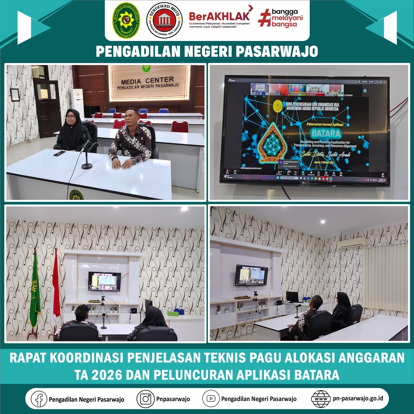Pasarwajo | Jumat, 17 Oktober 2025, Sekretaris Pengadilan Negeri Pasarwajo Bapak Dedy Eryawan, S.Kom. bersama Kasubbag Perencananaan, Teknologi Informasi dan Pelaporan Ibu Nur Dwi Rahti, S.H., M.H. sedang mengikuti kegiata Rapat Koordinasi Penjelasan Teknis Pagu Alokasi Anggaran TA 2026 Dan Peluncuran Aplikasi BATARA sehubungan dengan selesainya rencana kerja anggaran Mahkamah Agung TA 2026 dan Inovasi aplikasi BATARA (Budgeting and Planning Application for Transparency, Accuracy and Resource Alignment), platform digital terintegrasi yang menghubungkan data SDM, aset dan keuangan untuk proses perencanaan dan penganggaran hingga monitoring dan evaluasi dalam satu sistem yang berbasis data tunggal. Kegiatan tersebut di ikuti secara daring atau virtual bertempat di Media Center Pengadilan Negeri Pasarwajo.