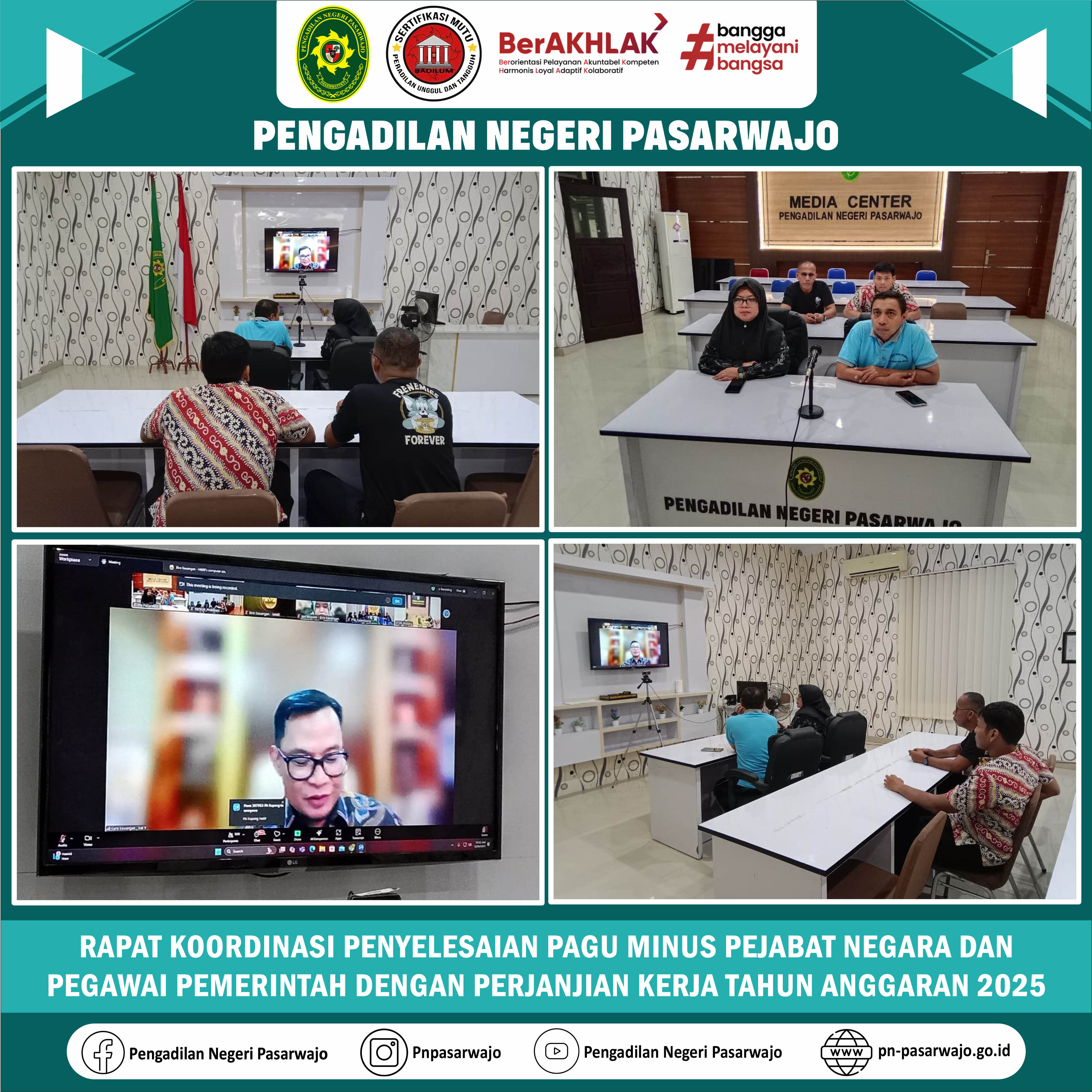 Pasarwajo | Jumat, 29 Agustus 2025, Ibu Nur Dwi Rahti, S.H., M.H., Plh Sekretaris didampingi oleh Kasubbag Umum dan Keuangan serta Staf Pengelola Keuangan mengikuti kegiatan Rapat Koordinasi Penyelesaian Pagu Minus Pejabat Negara dan Pegawai Pemerintah dengan Perjanjian Kerja Tahun Anggaran 2025. Kegiatan yang diikuti secara daring di Ruang Media Center Pengadilan Negeri Pasarwajo ini dilaksanakan dalam rangka Koordinasi Penyelesaian Pagu Minus Pejabat Negara dan Pegawai Pemerintah dengan Perjanjian Kerja Tahun Anggaran 2025. Kegiatan ini berjalan dengan baik dan lancar dari awal hingga akhir.