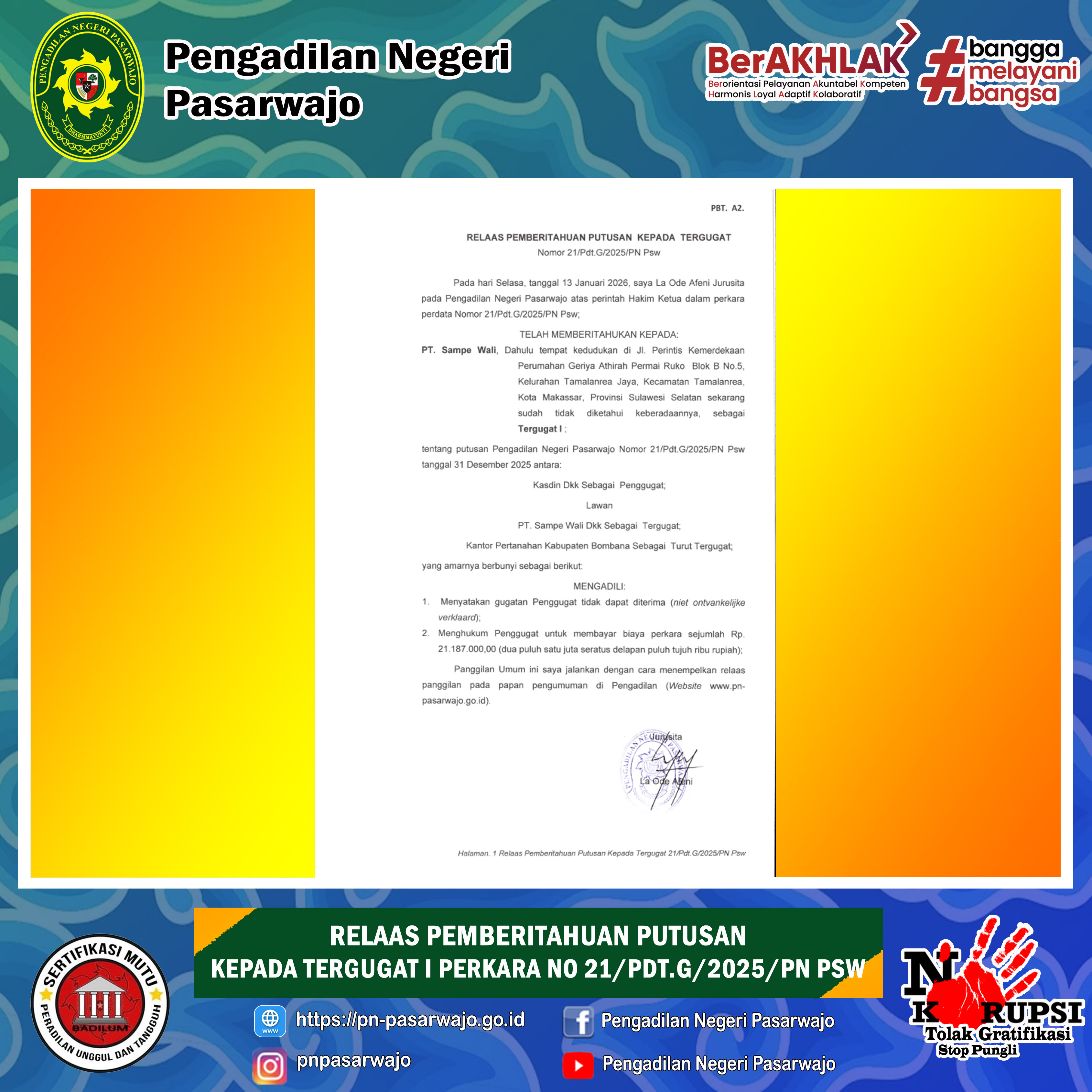 Pasarwajo | Selasa, 13 Januari 2026, diberitahukan Relaas Pemberitahuan Putusan Kepada Tergugat I Perkara Nomor 21/Pdt.G/2025/PN Psw a.n PT. Sampe Wali yang dahulu tempat kedudukan di Jl. Perintis Kemerdekaan Perumahan Geriya Athirah Permai Ruko Blok B No.5, Kelurahan Tamalanrea Jaya, Kecamatan Tamalanrea, Kota Makassar, Provinsi Sulawesi Selatan sekarang sudah tidak diketahui keberadaannya secara pastinya dalam Wilayah Hukum Negara Republik Indonesia