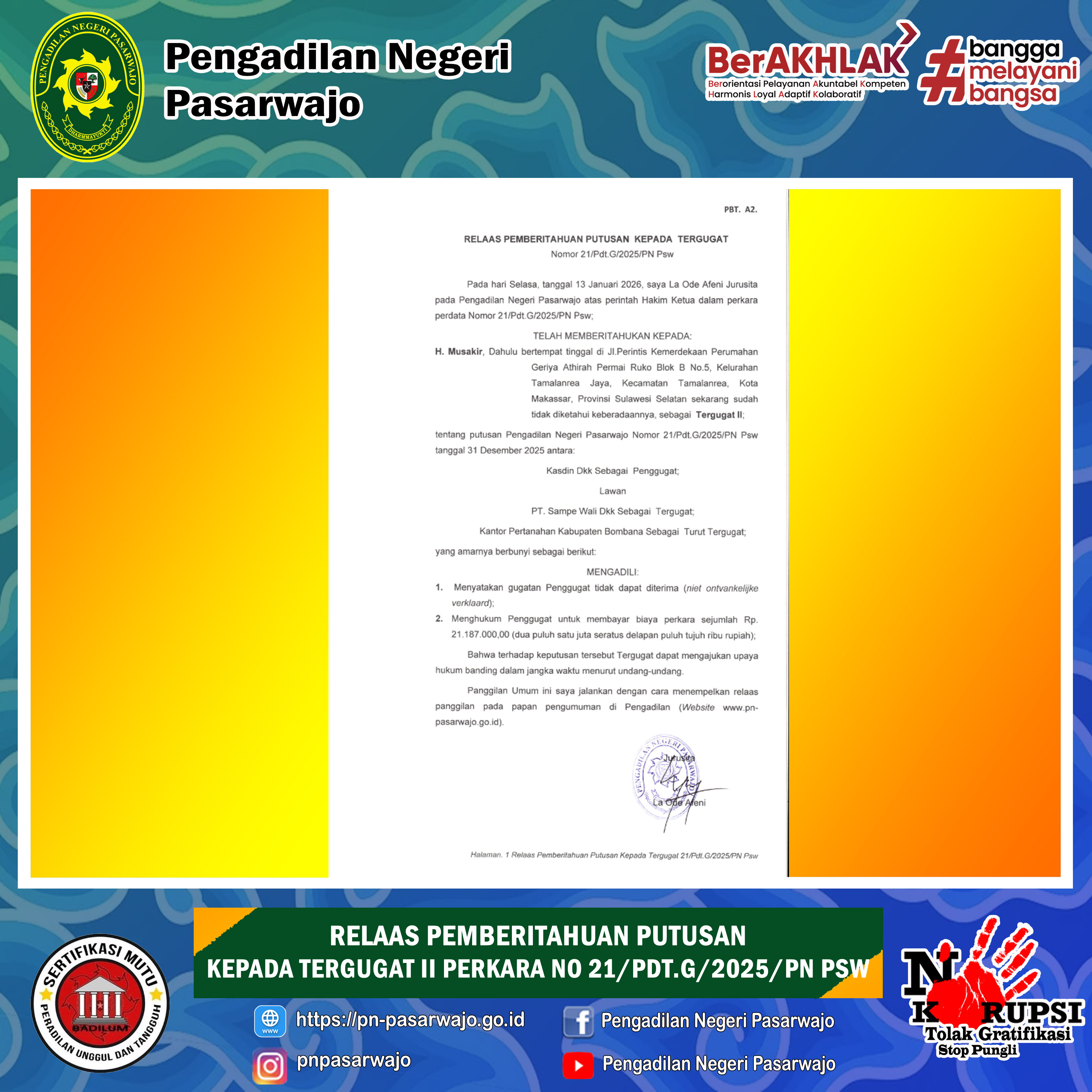Pasarwajo | Selasa, 13 Januari 2026, diberitahukan Relaas Pemberitahuan Putusan Kepada Tergugat II Perkara Nomor 21/Pdt.G/2025/PN Psw a.n H. Musakir, Dahulu bertempat tinggal di Jl.Perintis Kemerdekaan Perumahan Geriya Athirah Permai Ruko Blok B No.5, Kelurahan Tamalanrea Jaya, Kecamatan Tamalanrea, Kota Makassar, Provinsi Sulawesi Selatan sekarang sudah tidak diketahui keberadaannya secara pastinya dalam Wilayah Hukum Negara Republik Indonesia