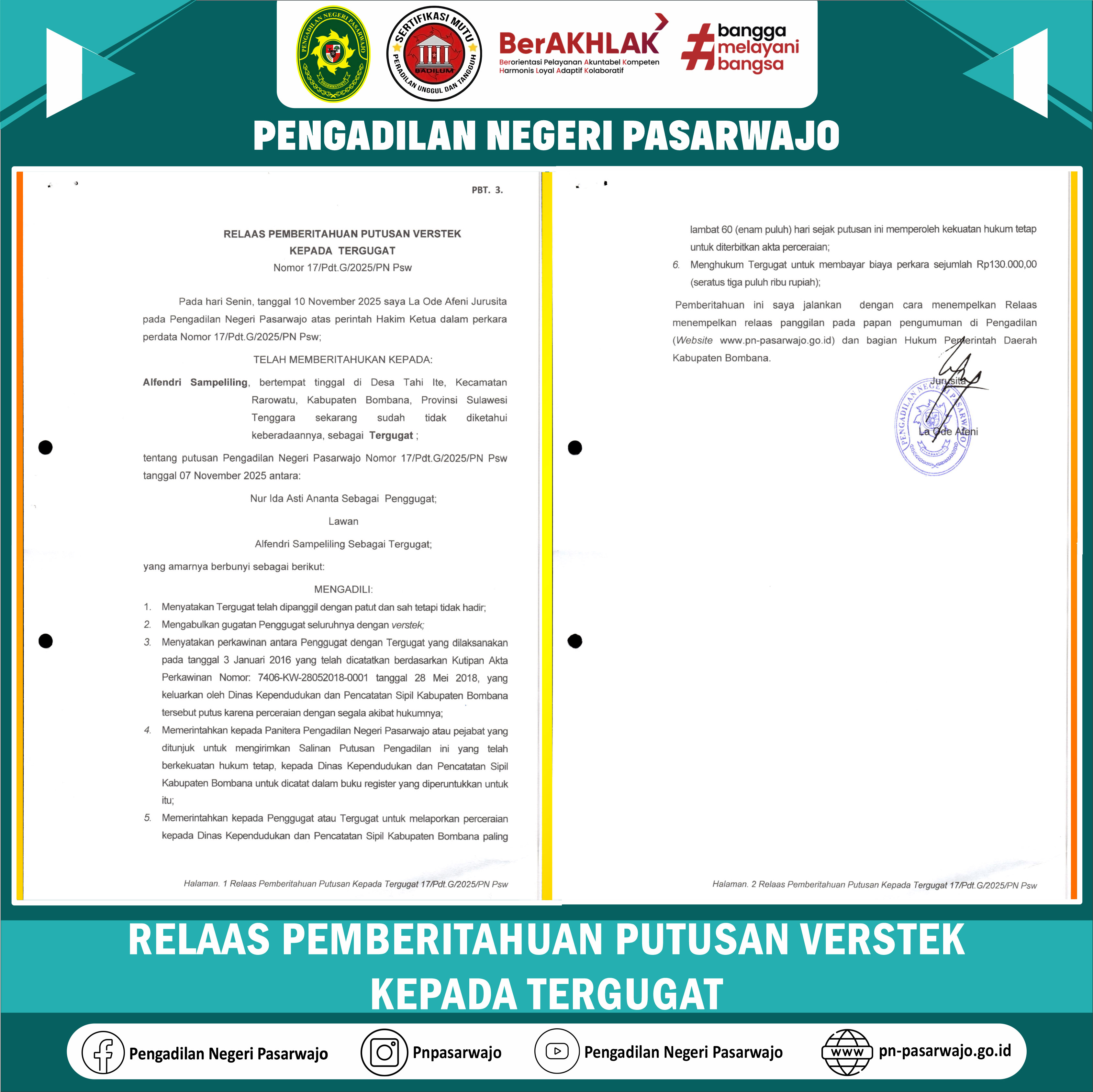 Pasarwajo | Senin, 10 November 2025, diberitahukan Relaas Pemberitahuan Putusan Verstek Kepada Tergugat Perkara Nomor 17/Pdt.G/2025/PN Psw a.n Alfendri Sampeliling yang dahulu bertempat tinggal di Desa Tahi Ite, Kecamatan Rarowatu, Kabupaten Bombana, Provinsi Sulawesi Tenggara sekarang sudah tidak diketahui keberadaannya secara pastinya dalam Wilayah Hukum Negara Republik Indonesia, tentang putusan Pengadilan Negeri Pasarwajo Nomor 17/Pdt.G/2025/PN Psw tanggal 07 November 2025