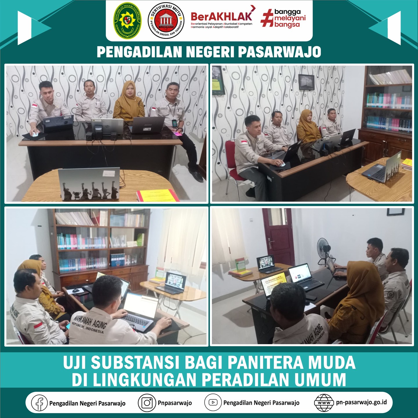 Pasarwajo | Kamis, 16 Oktober 2025, Bapak Haslim, S.H.,Panitera Muda Perdata dan Ibu Lisnina, S.H., Panitera Muda Pidana didampingi oleh Bapak Indra Kurnia Sinulingga, S.H., M.H., Hakim Pengadilan Negeri Pasarwajo dan Bapak Suripto, Panitera Pengadilan Negeri Pasarwajo mengikuti kegiatan Simulasi Uji Substansi bagi Panitera Muda Pengadilan Tinggi dan Panitera Muda Pengadilan Negeri di Lingkungan Peradilan Umum . Kegiatan tersebut diikuti secara daring di Ruang Media Center Pengadilan Negeri Pasarwajo. Dalam kegiatan simulasi ini panitia menjelaskan tentang teknis dalam pelaksanaan Uji Kompetensi yang akan dilaksanakan beberapa hari kedepan. Diharapkan dengan dilaksanakan simulasi ini maka pelaksanaan Uji Substansi Panitera Muda nantinya dapat berjalan dengan baik dan lancar