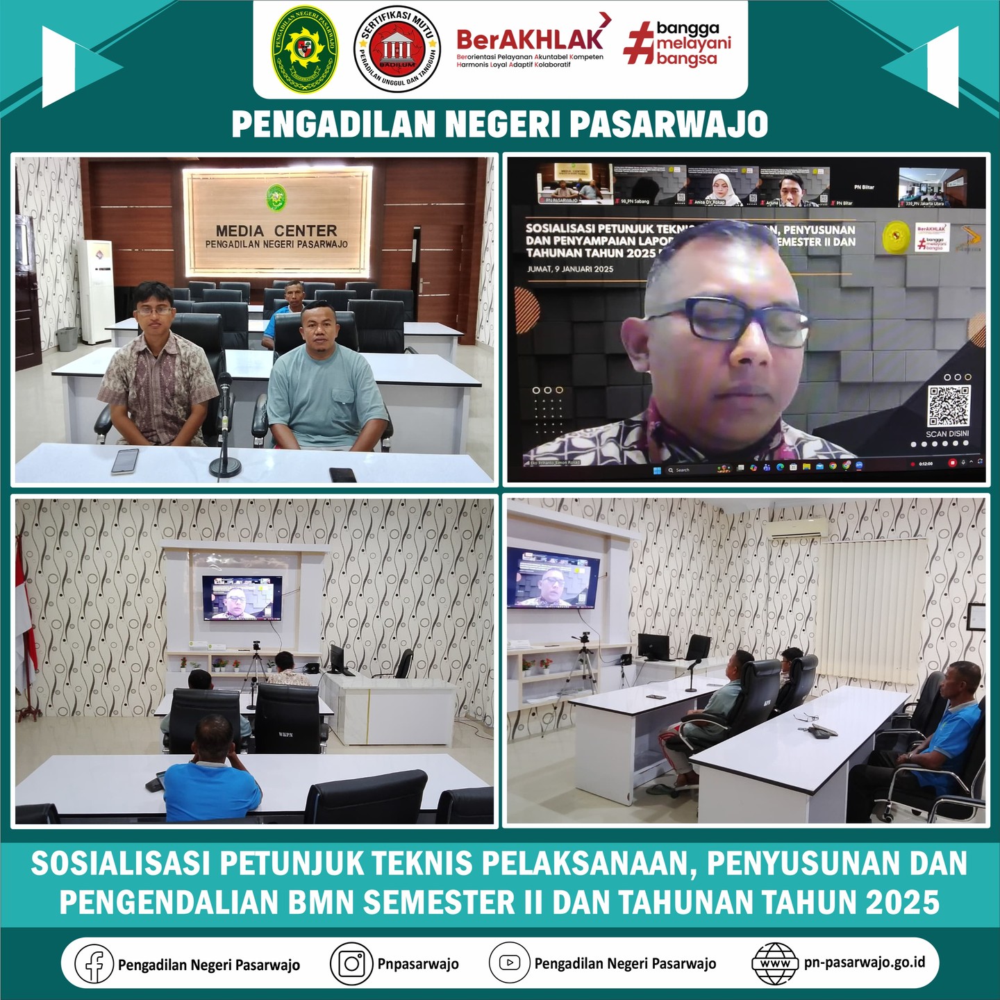 Pasarwajo | Jumat, 9 Januari 2026, Staf Pengelola BMN Bapak M. Hafis Satria Putra, S.T. Bersama Staf Urusan Umum dan Keuangan Bapak La Roma Dan Bapak La Sama Ali telah mengikuti kegiatan Sosialisasi Petunjuk Teknis Pelaksanaan, Penyusunan dan Penyampaian Laporan Pengawasan dan Pengendalian BMN Semester II dan Tahunan Tahun 2025 Sehubungan dengan surat Sekretaris Mahkamah Agung Republik Indonesia Nomor 22/SEK/PL1.2.7/I/2026 yang diselenggarakan oleh Badan Urusan Administrasi Mahkamah Agung Republik Indonesia. Kegiatan tersebut di ikuti secara daring atau virtual bertempat di Media Center Pengadilan Negeri Pasarwajo.