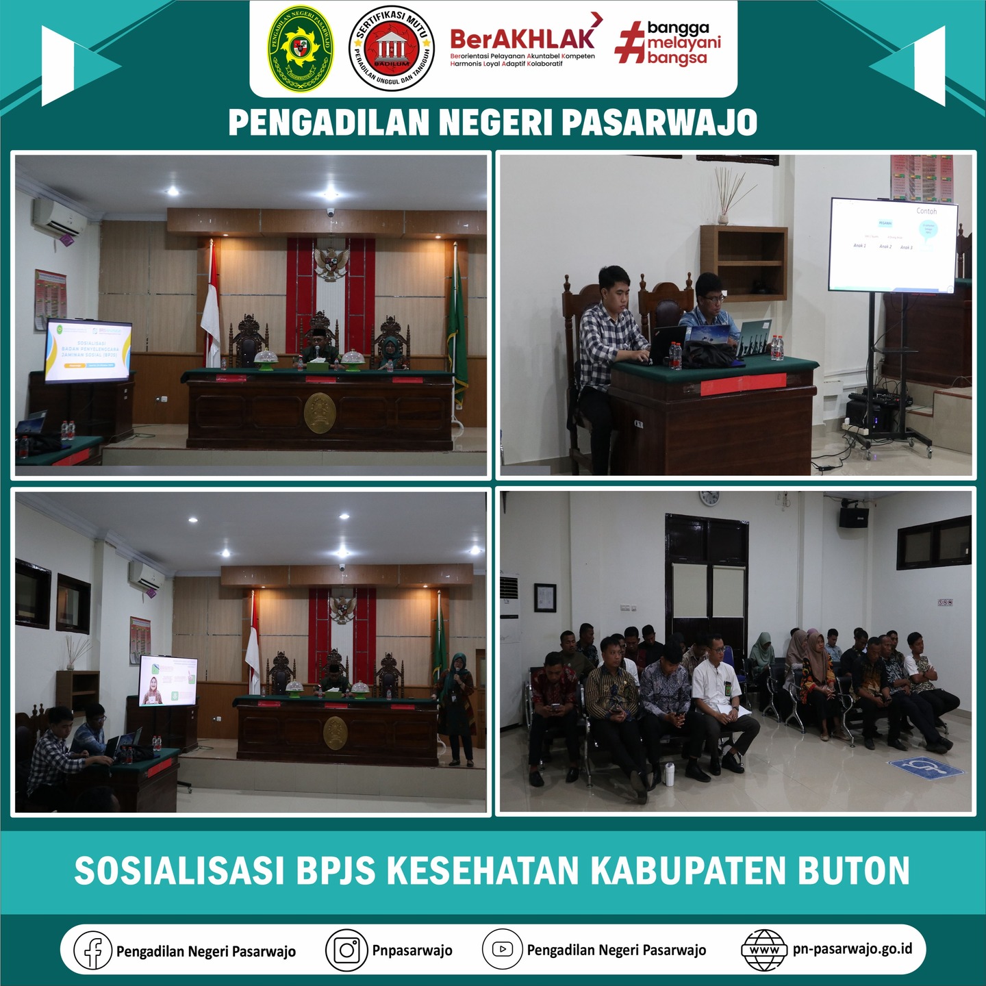 Pasarwajo | Jumat, 24 Oktober 2025, telah dilaksanakan Sosialisasi dari BPJS Kabupaten Buton sehubungan dengan surat Kepala BPJS Kesehatan Kab. Buton terkait pelaksanaan Sosialisasi BPJS Kesehatan. Kegiatan ini dihadiri oleh Pihak BPJS Kabupaten Buton selaku narasumber sosialisasi ini serta Ketua Pengadilan Negeri Pasarwajo Bapak Ivan Budi Hartanto, S.H., M.H. bersama keluarga Besar Pengadilan Negeri Pasarwajo. Tujuan dari Sosialisasi ini adalah untuk meningkatkan kualitas layanan kepada peserta BPJS Kesehatan dan melakukan transformasi mutu layanan dalam upaya untuk meningkatkan pemahaman setiap peserta terhadap program JKN. Kegiatan tersebut dilaksanakan di Ruang Sidang Cakra Pengadilan Negeri Pasarwajo.